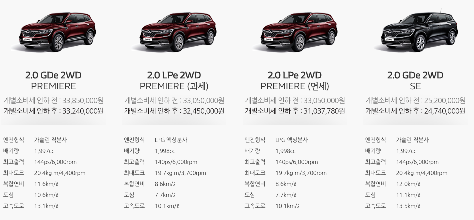 2.0 GDe 가격 2천5백2십만원 ~ 3천9십5만원, 2.0 LPe 2천4백8십만원 ~ 3천5십5만원, 2.0 프리미어 3천3백8십5만원