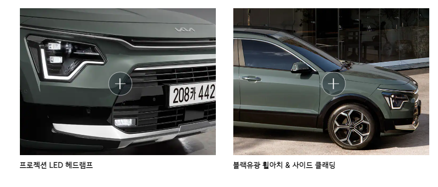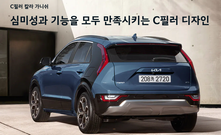 외장 디자인 특징으로는 전면부는 타이거 페이스 컨셉으로 프로젝션 LED 헤드램프와 측면부에서는 블랙유광 휠아치&사이드 클래딩, 후면부는 LED 리어콤비네이션 램프 그리고 심미성과 기능을 모두 만족시키는 C필러 칼라 가니쉬 디자인이 신형 니로 하이브리드 외장 디자인 특징이라 할 수 있습니다.