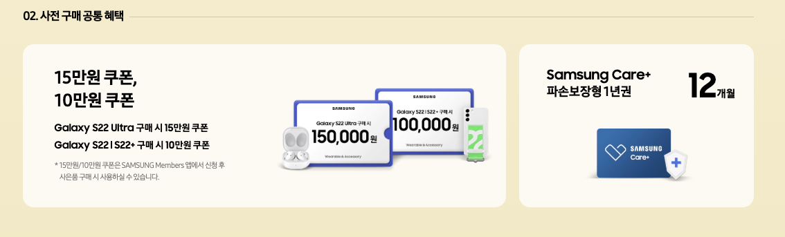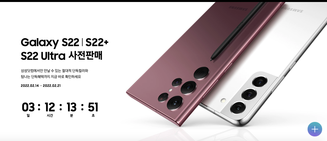 삼성전자에서 지난 14일부터 진행된 갤럭시 s22 사전예약 판매 이벤트를 2월21일까지 진행 중입니다. skt, kt,LG유플러스 등 이동통신 3사를 통해 예약판매 첫날 역대 최고 실적을 기록하면서 쿠팡은 갤럭시S22 시리즈 제품 사전예약을 진행하는 고객에게 갤럭시 웨어러블 제품을 30% 할인되는 쿠폰을 제공하는가 하면 11번가는 14일 자정부터 진행한 갤럭시 s22 시리즈 자급제 모델 라이브방송에서 전기종 모두 완판되며 빠르게 품절됐다고 전했습니다.