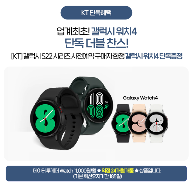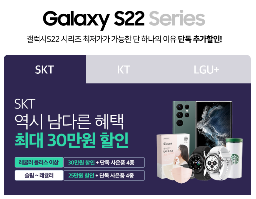 뉴버스폰 네이버 카페에서 사전예약 진행 시 사은품 대신 최대 30만원 단독 가격 할인 혜택을 시작으로 kt단독 워치4 무료증정과 통신사를 통한 가입 시 약정기간은 2년이 아닌 12개월이 가능하며 개통 후 4개월뒤 어떤 요금제로 변경해도 위약금 미발생하여 매월 통신비 절약 및 제품가격을 합리적인 가격으로 갤럭시 s22 시리즈를 구매할 수 있습니다.