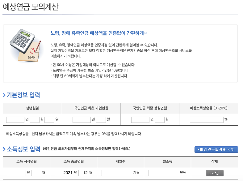 국민연금 최초 가입년월 및 소득 시작년월, 출산 정보 입력 등을 기입해야 합니다. 다만 기억이 잘 나지 않을 경우에는 공인인증서를 준비하여 로그인 하시면 보다 빠르게 확인하실 수 있습니다.
