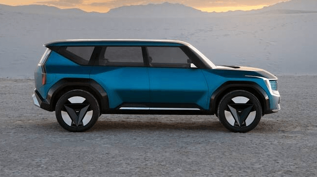 측면부는 기아 대형 suv 텔루라이드 모습과 유사한 강인하고 단단한 인상을 보여줍니다. 단 전기차 고유의 특징을 살리기 위해 삼각형의 공력부 원형22인치 타이어 휠이 돋보입니다.