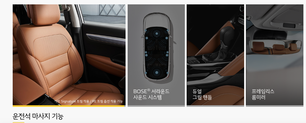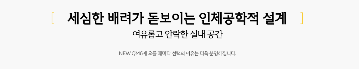 최근 차박(자동차 숙박) 캠핑이 유행하면서 운전석 뿐만 아니라 2열 뒷좌석 공간과 안락함을 중요하게 생각합니다. 이러한 국내 소비자들의 니즈를 반영한듯 뉴 QM6 페이스리프트에서는 2열 리클라이닝 시트를 적용하여 최대 32도까지 등받이 각도를 조절할 수 있으며 289mm의 여유로운 뒷좌석 무릅 공간을 확보하여 보다 편안한 실내공간을 연출하였습니다. 시트 색상도 모던 브라운 가죽 시트를 적용하여 한층 고급스런 유럽 감성을 가져왔습니다. 장시간 운전에 도움이 되는 운전석 마사지 기능과 BOSS 서라운드 사운드 시스템은 드라이빙의 재미를 더했습니다.