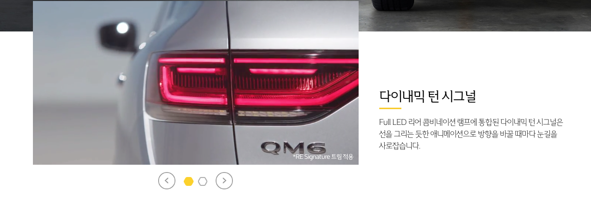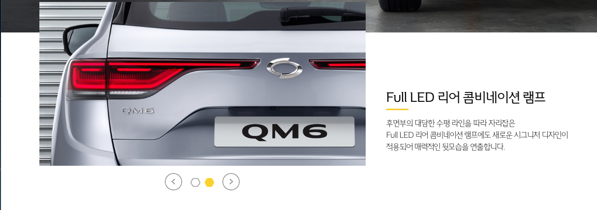 후면부에서 획기적인 변화를 주었습니다. 이번에 출시된 뉴 QM6 페이스리프트는 Full LED 리어 콤비네이션 램프를 적용하여 보다 선명하고 미래지향적인 이미지를 보여주고 있고 국내 고급모델과 수입차에서 최근 적용된 좌우 차선변경시 방향지시등 램프가 선을 그리듯 자연스럽게 이동하는 다이내믹 턴 시그널 시스템을 탑재한 것이 가장 인상적이라 할 수 있겠습니다.