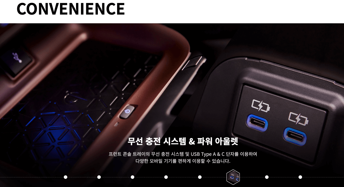 실내디자인 같은 경우는 안드로이드 애플 연동이 가능한 7인치 터치스크린이 정면 센터페시아에 위치해있고, 센터 콘솔에는 드라이브 모드 셀렉터(AWD 모델)가 탑재되었고, 고급 모델 옵션에 적용되는 무선 충전 시스템 및 파워 아울렛 단자를 적용하여 이전 모델 대비 보다 세련된 실내 디자인을 보여주고 있습니다.