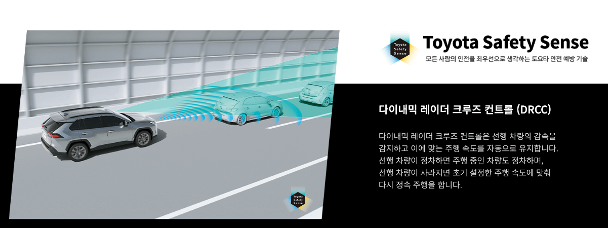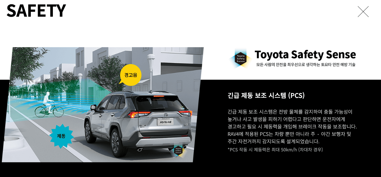 2022 라브4 하이브리드 장점으로는 연비 효율 뿐만 아니라 고급 모델에 적용되는 편의 안전사양 옵션들을 대거 장착하였습니다. 긴급 제동 보조 시스템(PCS), 다이내믹 레이더 크루즈 컨트롤(DRCC), 차선 추적 어시스트(LTA), 오토매틱 하이빔(AHB), 사각지대 감지 모니터(BSM), 차량 접근 알림 시스템 등등 옵션을 탑재 하였습니다.