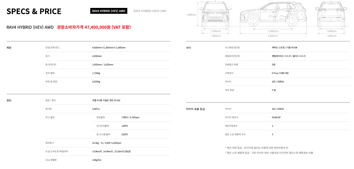 라브4 하이브리드 트림별 가격은 2WD XLE 트림 4,170만원, AWD LTD 트림 4,740만원 이고, 파워트레인 및 간단한 제원을 살펴보면 2.5 L 다이나믹 포스 엔진과 무단 자동변속기 조합으로 최대출력 218마력, 최대 토크 22.5kg.m 의 힘을 자랑합니다. 크기는 전장 4,600mm, 전폭 1,855mm, 전고 1,685mm, 휠베이스 2,690mm 국내 투싼급 크기의 포지션에 위치해 있으며 맥퍼슨 스트럿과 더블 위시본 서스펜션 적용으로 편안한 승차감을 높였습니다. 연비는 하이브리드에 걸맞게 15km/L 높은 연비로 경제적인 효율성을 높였다고 볼 수 있습니다.