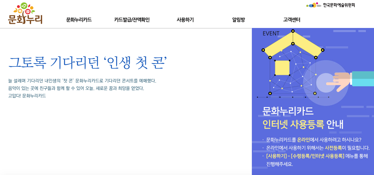 코로나 시대를 맞아 온라인 가맹점에서도 사용이 가능합니다. 유튜브, 넷플릭스, 왓챠, 네이버 시리즈온, 멜론, 지니뮤직, 벅스, 밀리의 서재, 리디북스, 네이버웹툰, 카카오페이지, 클래스 101, 클래스톡, vible, 홈키트 문화체험 두굳두굳 등 온라인 상에서도 사용이 가능합니다.