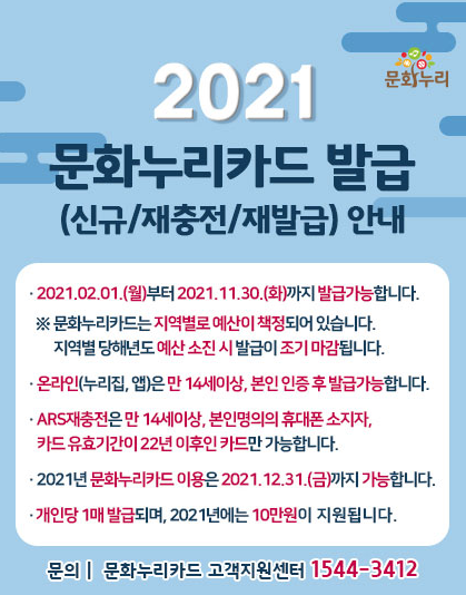 문화누리카드는 지역별로 예산이 책정되어 있어 올해 2021년 12월31일(금)까지만 사용이 가능합니다. 개인당 1매 발급되며, 2021년에는 10만원이 지원됩니다. 연말까지 사용하지 않은 금액은 이월되지 않고 국고에 환수되므로 이용 기간 내에 모두 사용해야 하는점 유의하시기 바랍니다. 더 궁금하거나 문의사항이 있으면 문화누리카드 고객지원센터 1544-3412 으로 유선연락하여 문의하시면 되겠습니다.