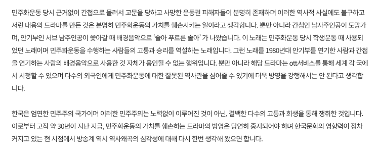 이하생략... 민주화 운동의 가치를 훼손하는 드라마의 방영은 당연히 중지되어야 하며 한국문화의 영향력이 점처 커지고 있는 현 시점에서 방송계 역시 역사왜곡의 심각성에 대해 다시 한번 생각해 봤으면 합니다.