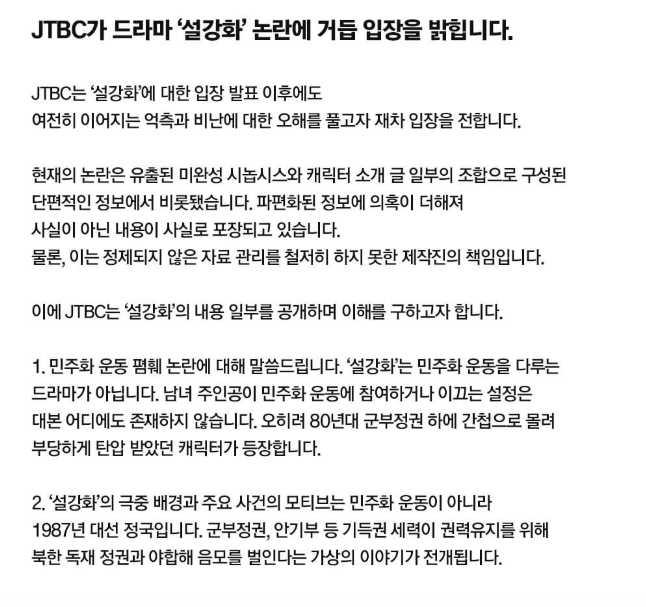 jtbc 드라마 측에서는 현재 논란은 미완성 시놉시스와 캐릭터 소개 글 일부의 조합으로 구성된 단편적인 정보에서 비롯됐습니다. 파편화된 정보에 의혹이 더해져 사실이 아닌 내용이 사실로 포장되고 있습니다. 1. 민주화 운동 폄훼 논란에 대해서 '설강화는 민주화 운동을 다루는 드라마가 아닙니다. 이어 남녀 주인공이 민주화 운동에 참여하거나 이끄는 설정은 대본 어디에도 존재하지 않습니다' 라며 강조하였고, 이외에도 남파 공작원, 안기부 요원 캐릭터 관련, 극중 캐릭터 천영초 선생님 관련 등등의 논란은 미방영 드라마에 대한 허위사실을 기정사실인양 포장해 여론을 선동하는 행위를 자제해주시길 부탁드립니다. 라며 당부의 말을 전했습니다.