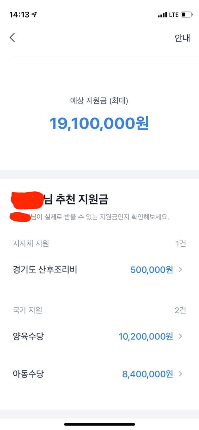 모든 사항을 체크하고 나면 예상지원금액이 나옵니다. 자녀가 있다면 산후조리비, 양육수당, 아동수당 등이 당연히 나오게 됩니다. 이상으로 보조금24, 토스(toss)앱으로 숨은정부지원금 찾는 방법을 함께 알아보았습니다. 아직 확인 못하신 분들은 서둘러 확인해보시고 찾아가시기 바랍니다.