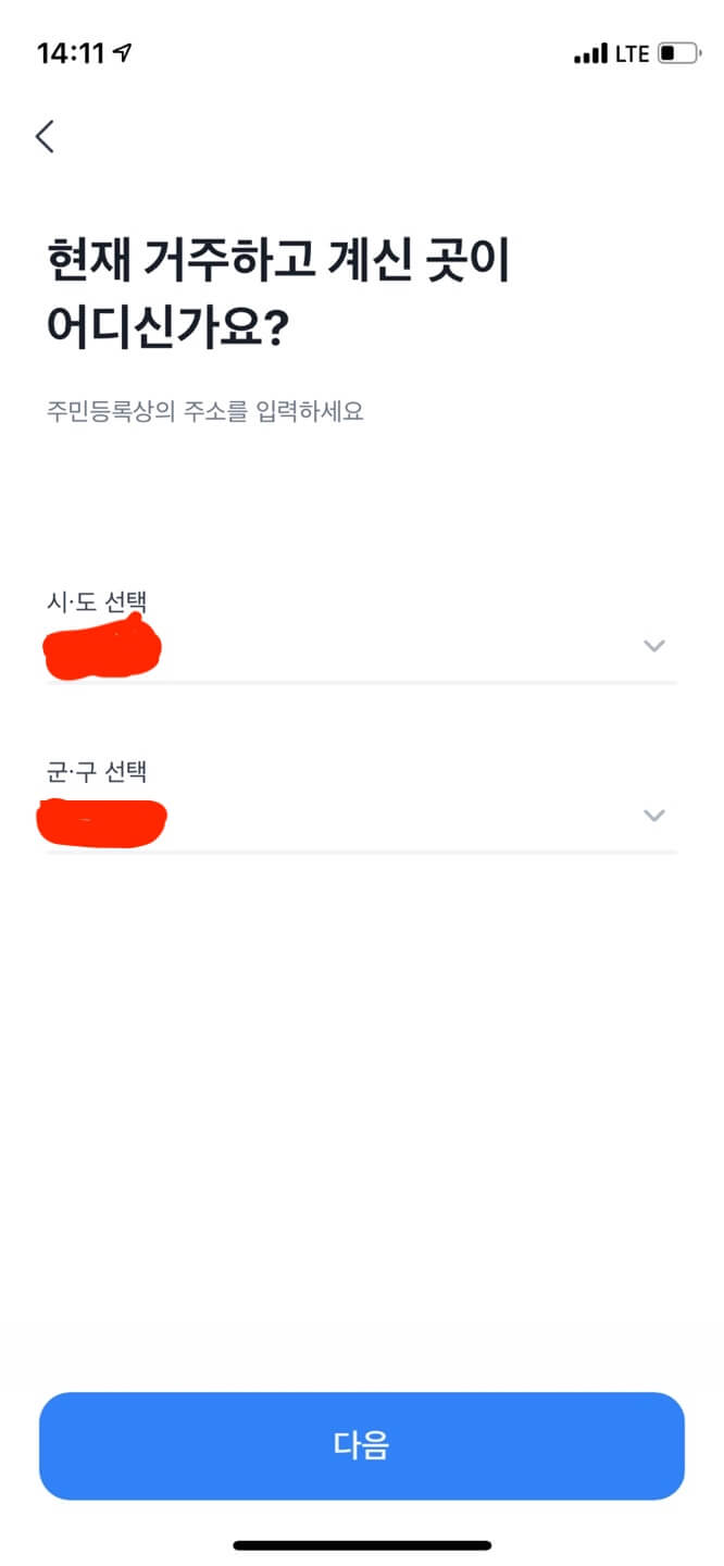 숨은 정부지원금 찾기로 들어가면 먼저 주민등록상 주소지 확인을 위해 시도, 군구를 선택해 줍니다.