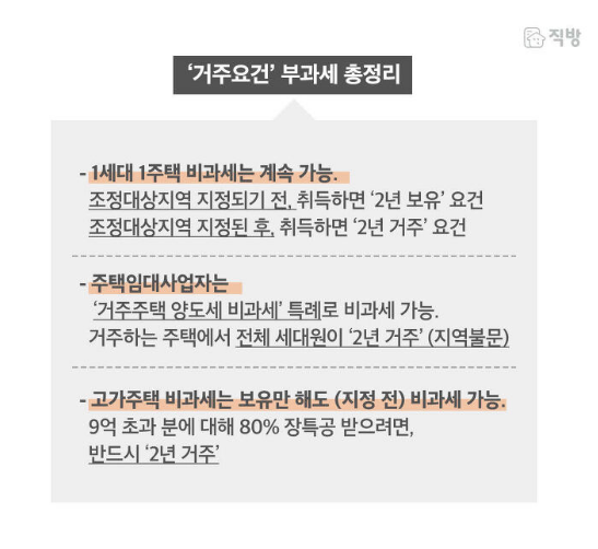 먼저 1가구 1주택 양도세 비과세 면제기준(요건) 부터 살펴보면 1세대가 1주택을 2년이상 보유해야 하며, 2017년 8월3일 이후에 취득한 주택(아파트)의 경우 취득 당시 조정대상지역이면 2년 이상 거주 비조정대상지역이면 2년이상 보유만 해도 됩니다. 양도가액은 9억원을 초과하지 않을때 비과세 혜택을 받을 수 있습니다.