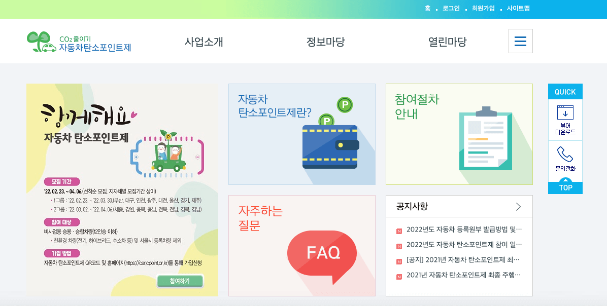 2022년 2월23일부터 자동차 탄소포인트제 신청 접수를 받고 있습니다. 신청완료 후 감축거리에 따라 최대 10만원을 지급 받을 수 있습니다. 공식 홈페이지 누리집에서 신청하는 방법을 알려 드리겠습니다.