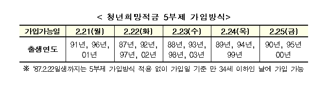청년희망적금 신청이 오는 21일부터 25일까지 5부제 방식으로 접수 받고 있습니다. 금융위원회는 21일 부터 국민, 신한1, 하나, 우리, 농협, 기업, 부산, 대구, 광주, 전북, 제주은행 총 11개 시중은행에서 출시돼 1개 은행을 선택, 1개 계좌만 개설할 수 있고 대면,비대면으로 가입이 가능하다고 밝혔습니다.