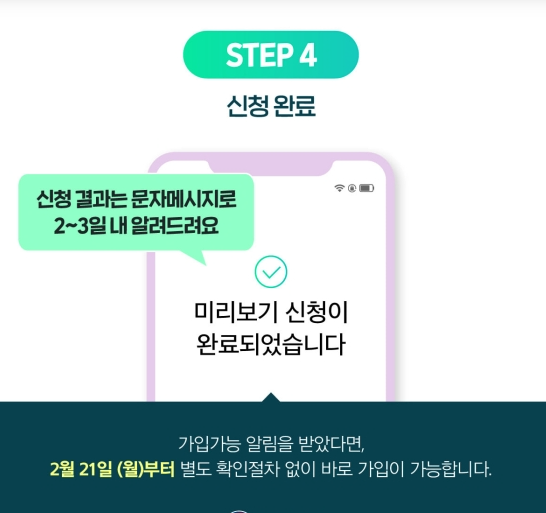 마지막으로 신청 완료 미리보기 신청이 완료되었습니다. 메세지를 확인하면 신청 접수가 됩니다. 신청 결과는 문자메세지로 2~3일 내 알려드립니다. 더불어 가입가능 알림을 받았다면 2월21일(월)부터 별도 확인절차 없이 바로 가입이 가능합니다.
