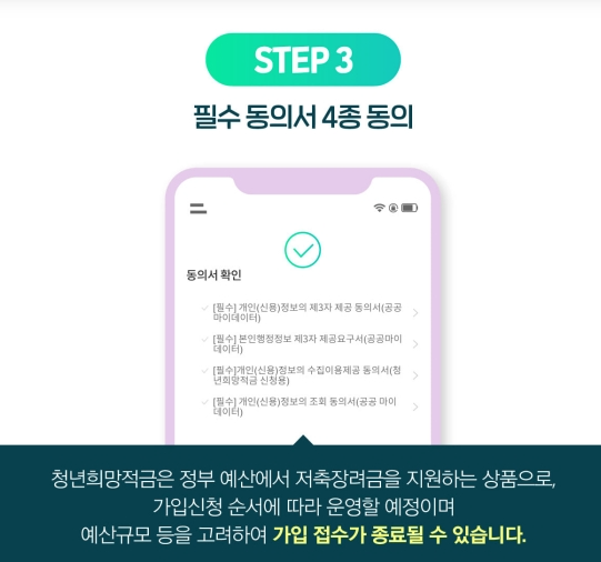 세번째 필수 동의서 4종 동의에 체크합니다. 청년희망적금은 정부 예산에서 저축장려금을 지원하는 상품으로 가입신청 순서에 따라 운영할 예정으로 예산규모 등을 고려하여 가입 접수가 종료될 수 있습니다.