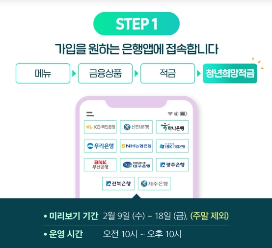 먼저 본인이 원하는 은행앱에 접속합니다. 메뉴에서 금융상품으로 들어가서 적금 청년희망적금으로 들어갑니다. 참고로 운영 시간은 오전 10시 ~ 오후 10시까지 입니다.
