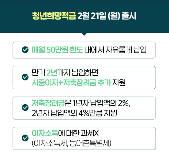 청년희망적금은 매월 50만원 한도 내에서 자유롭게 납입할 수 있는 적금상품으로 가입기간은 2년이며 가입 연령 으로는 가입일 기준 만 19세 이상 만 34세 이하 청년 대상으로 가입 직전 과세기간 2021년 1월 ~ 12월의 총급여액이 3600만원 이하 소득인 청년들에게 해당되는 적금 상품입니다.