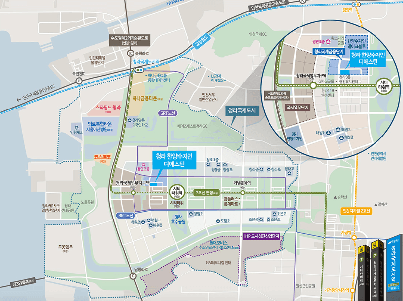 청라 한양 수자인 디에스틴 주변에 지하철 7호선 연장 예정, 제3연륙교 착공예정으로 완공 시 영종도부터 여의도까지 30분대 이동이 가능합니다. 지하철 이용 시 서울까지 약40분대 진입이 가능하며 시티타워역과 국제금융단지역 사이에 있어 수도권 진입이 용이합니다. 생활인프라는 청라시티타워, 청라국제업무단지를 비롯한 청라의료복합타운, 하나드림타운, 스타필드청라, 코스트코 등 생활편의시설이 잘 갖춰져있습니다.