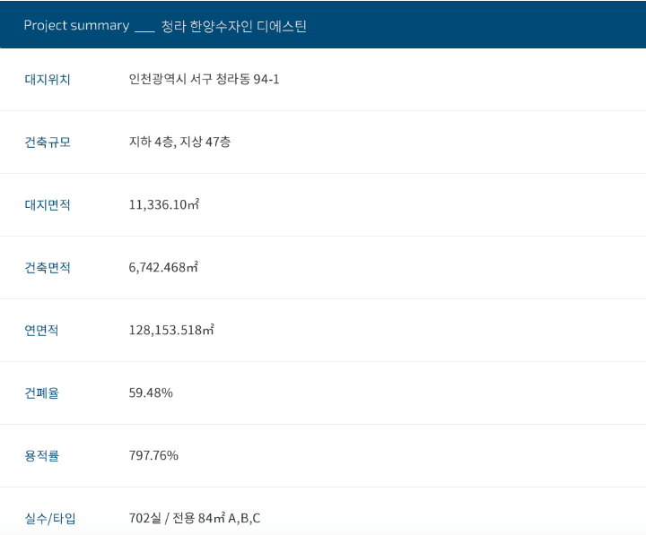 위치 : 인천광역시 서구 청라동 94-1, 규모 : 지하4층 ~ 지상47층 3개동 703세대, 대지면적 : 11,336,10㎡, 연면적 : 128,153,518㎡, 건폐율 : 59.48%, 용적률 : 797.76, 타입 : 84A 234세대, 84B 234세대, 84C 234세대입니다.