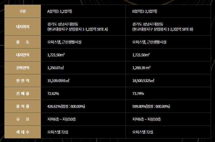 위치는 경기도 성남시 대장동 판교대장지구 상업용지 1-1,2블록, 3블록, 규모는 지하6층 ~ 지상10층 144세대 84㎡ 단일면적으로 용적률 426.61%, 건폐율 72.62% 입니다.