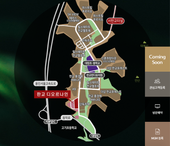 교통입지는 용서고속도로와 서판교 터널, 월판선 예정지인 서판교역과 인접해 있으며 서분당 ic를 함께 이용하면 판교 중심까지 차량으로 5분 판교테크노밸리까지 10분이면 도착 가능합니다. 더불어 분당수서고속도로, 경부고속도로를 서울 및 기타 경기도 수도권으로 진입이 매우 용이하여 교통입지는 매우 좋은 편입니다. 뿐만 아니라 태봉산, 진재산, 응달산 등 녹지환경이 잘 갖춰져있어 여유로운 주거환경을 누릴 수 있습니다.
