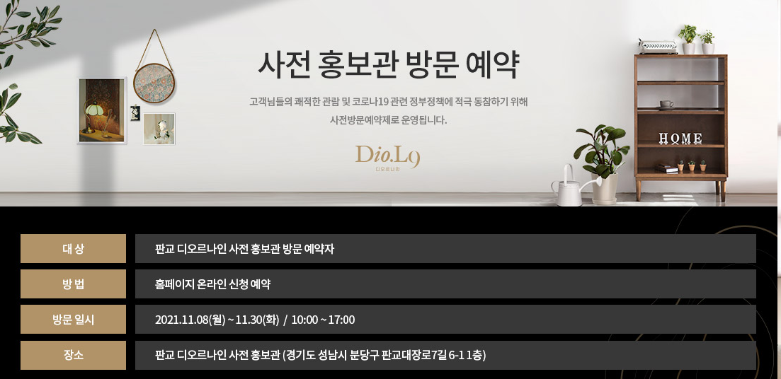 판교 디오르나인 모델하우스 견본주택 위치는 경기도 성남시 분당구 판교대장로7길6-1 1층으로 홈페이지에서 온라인 방문 예약을 신청 후 홍보관을 보실 수 있습니다. 방문일시는 21년 11월8일 ~ 11월30일 10:00 ~ 17:00까지 가능합니다.