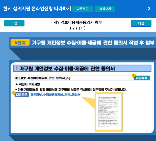3. 한시생계지원가구원 인적사항을 입력하고 가구원 개인정보 수집이용에 관한 동의서를 다운받아 작성하여 작성한 파일을 첨부하여 줍니다.
