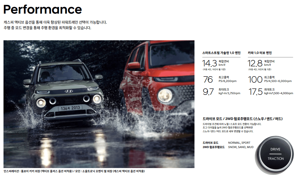현대자동차에서 아이코닉 디자인의 소형suv 캐스퍼를 출시하였습니다. 전체적인 느낌은 bmw 미니와 유사하지만 차량가격은 미니의 절반도 안되는 1385만원부터 시작되어 가성비가 뛰어나 현재 주문이 폭주하고 있습니다. 현대 캐스퍼 가솔린 1.0 기준 복합연비는 14.3km/ℓ로 연비까지 높아 흥행돌풍을 이어가고 있습니다.