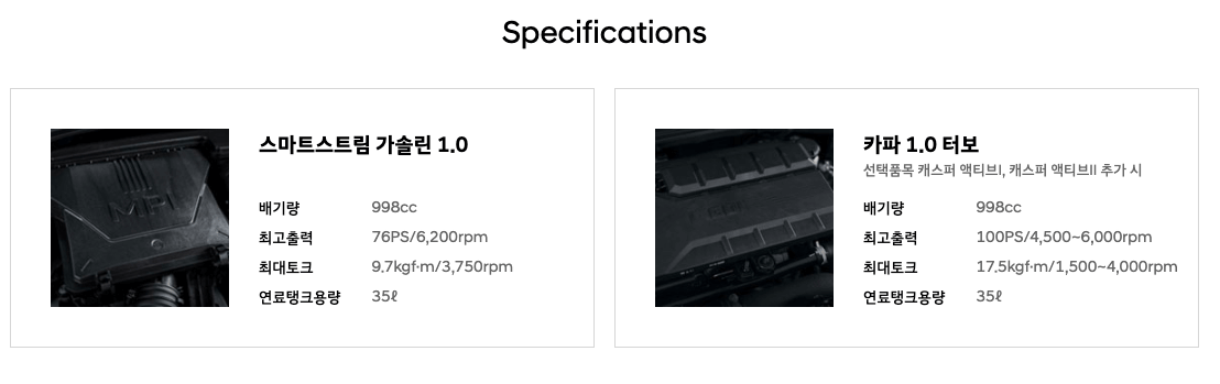 전장 3,595mm, 전고 1,575mm, 전폭 1,595mm, 휠베이스 2,400mm, 파워트레인은 스마트스트림 가솔린 1.0, 카파 1.0 터보가 있으며 배기량은 998cc, 최고출력 100마력(1.0터보기준), 최대토크 17.5kgf.m, 복합연비 14.3km/ℓ 를 자랑합니다.