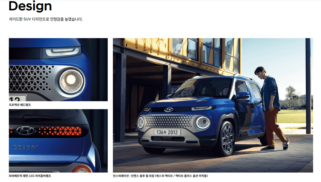 전면부는 파라메트릭 패턴이 적용된 라이에이터 그릴이 적용되어 미래지향적이고 개성있는 스타일을 연출하였고, 분리형의 독특한 원형 헤드램프가 캐스퍼만의 유니크함을 강조하고 있습니다. 측면부는 역동성과 볼륨감을 더해 작지만 단단하고 강인한 suv 면모를 보여주고 있습니다. 캐스퍼의 존재감은 후면부에서 더욱 부각됩니다. 전면부와 같이 파라메트릭 패턴의 LED리어콤비램프는 보는이로 하여금 자꾸 눈길이 가게 만듭니다.