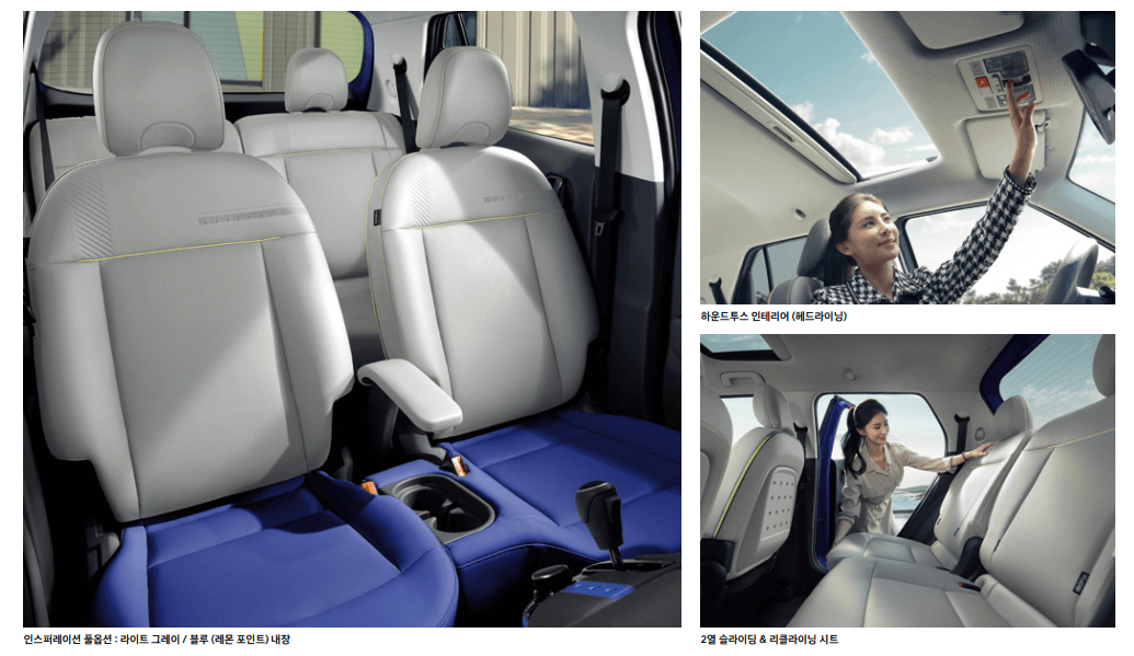 실내는 슬림하고 간결한 레이아웃으로 디자인 되어있고 경차이지만 suv 특성상 개방감은 좋습니다. 차박용 컨셉으로 나온 차량인 만큼 실내 무드램프가 야간 분위기와 감성을 자극시켜 줍니다. 4.2인치 컬러 LCD 클러스터와 8인치 개방형 네비게이션, 블루링크까지 편리한 드라이빙과 차량제어가 가능하도록 최신 편의사양이 탑재되어 있습니다. 2열 슬라이딩&리클라이닝 시트가 탑재되어 뒷좌석 탑승자에게 보다 편안한 승차감을 제공 해주고 있습니다.