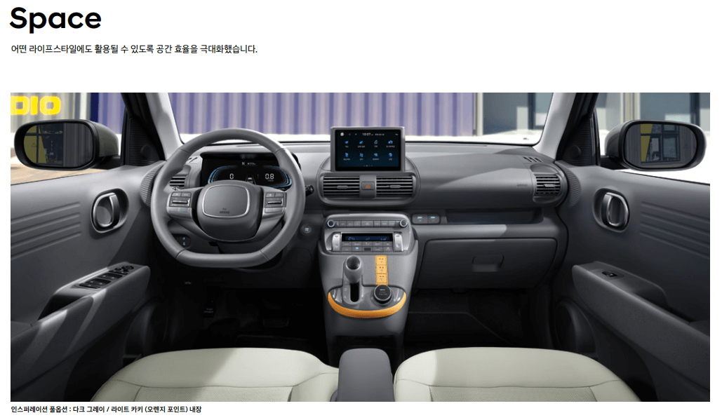 실내는 슬림하고 간결한 레이아웃으로 디자인 되어있고 경차이지만 suv 특성상 개방감은 좋습니다. 차박용 컨셉으로 나온 차량인 만큼 실내 무드램프가 야간 분위기와 감성을 자극시켜 줍니다. 4.2인치 컬러 LCD 클러스터와 8인치 개방형 네비게이션, 블루링크까지 편리한 드라이빙과 차량제어가 가능하도록 최신 편의사양이 탑재되어 있습니다. 2열 슬라이딩&리클라이닝 시트가 탑재되어 뒷좌석 탑승자에게 보다 편안한 승차감을 제공 해주고 있습니다.
