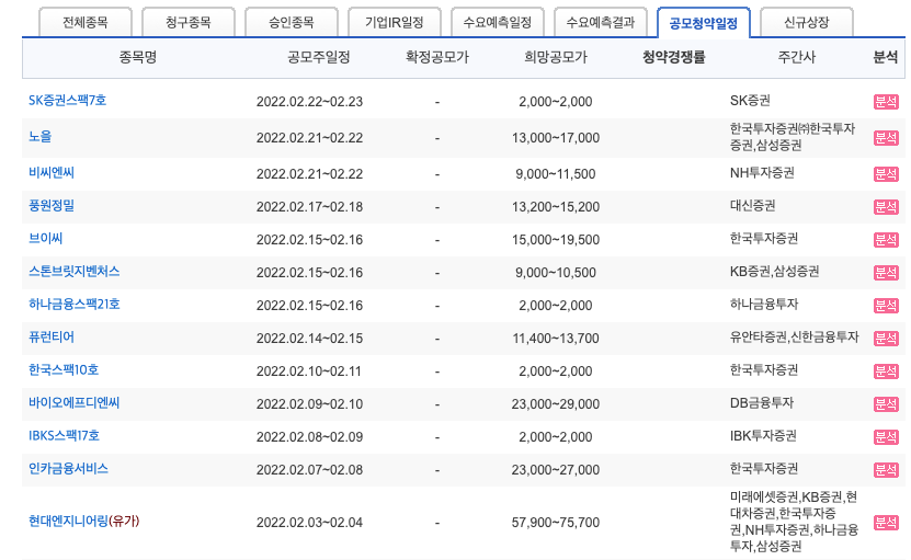 지난 1월 공모주 청약에서 화재가 되었던 LG에너지솔루션에 이어 2022년 2월 공모주에도 대어급인 현대엔지니어링 청약이 예정되어 있습니다. 이 외에도 바이오에프디앤씨, 퓨런티어, 풍원정밀, 인카금융서비스 등등 2월 공모주 IPO 기업들 청약일정을 함께 살펴보겠습니다.