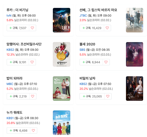 | 수목드라마 시청률 순위 2021년 3월 첫째주 (0) | 2021.03.04 |
