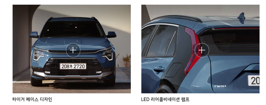 외장 디자인 특징으로는 전면부는 타이거 페이스 컨셉으로 프로젝션 LED 헤드램프와 측면부에서는 블랙유광 휠아치&사이드 클래딩, 후면부는 LED 리어콤비네이션 램프 그리고 심미성과 기능을 모두 만족시키는 C필러 칼라 가니쉬 디자인이 신형 니로 하이브리드 외장 디자인 특징이라 할 수 있습니다.