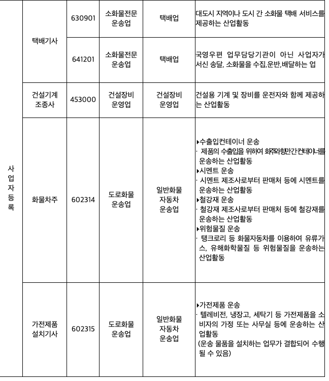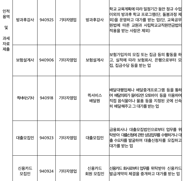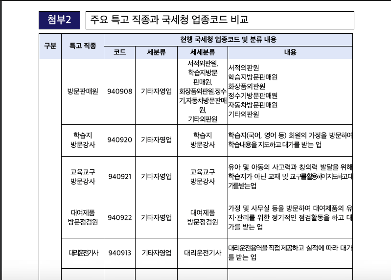 주요 특고 직종과 국세청 업무코드 비교